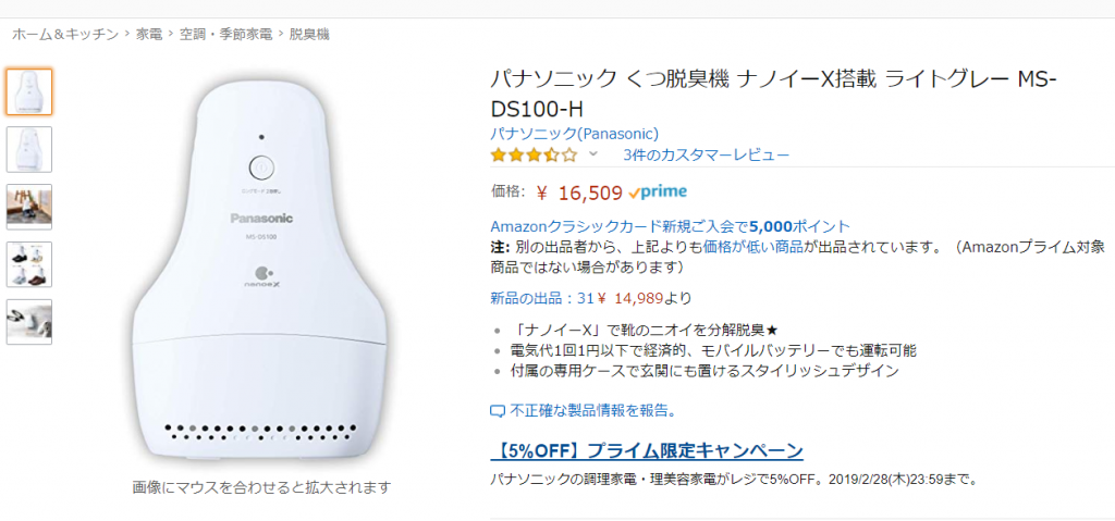 今気になっている製品がこちらの「パナソニック くつ脱臭機 ナノイーX搭載」です。