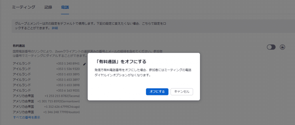 有料通話をオフにする確認画面が表示されますので、「オフにする」をクリックします。